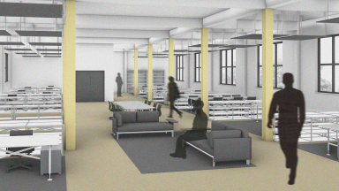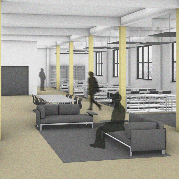 Im Sinne eines ressourcenschonenden und wirtschaftlichen Umgangs mit dem Bestand erfolgen die erforderlichen Modernisierungsmaßnahmen – insbesondere im Bereich der technischen Gebäudeausstattung wie Elektro- und Lüftungstechnik – sichtbar als Aufputzinstallationen. Diese bleiben nicht nur nachvollziehbar und flexibel, sondern unterstreichen bewusst den industriellen Charakter des Gebäudes.
